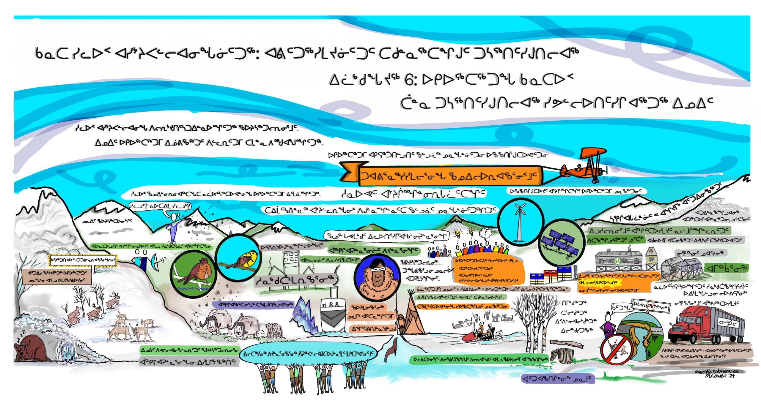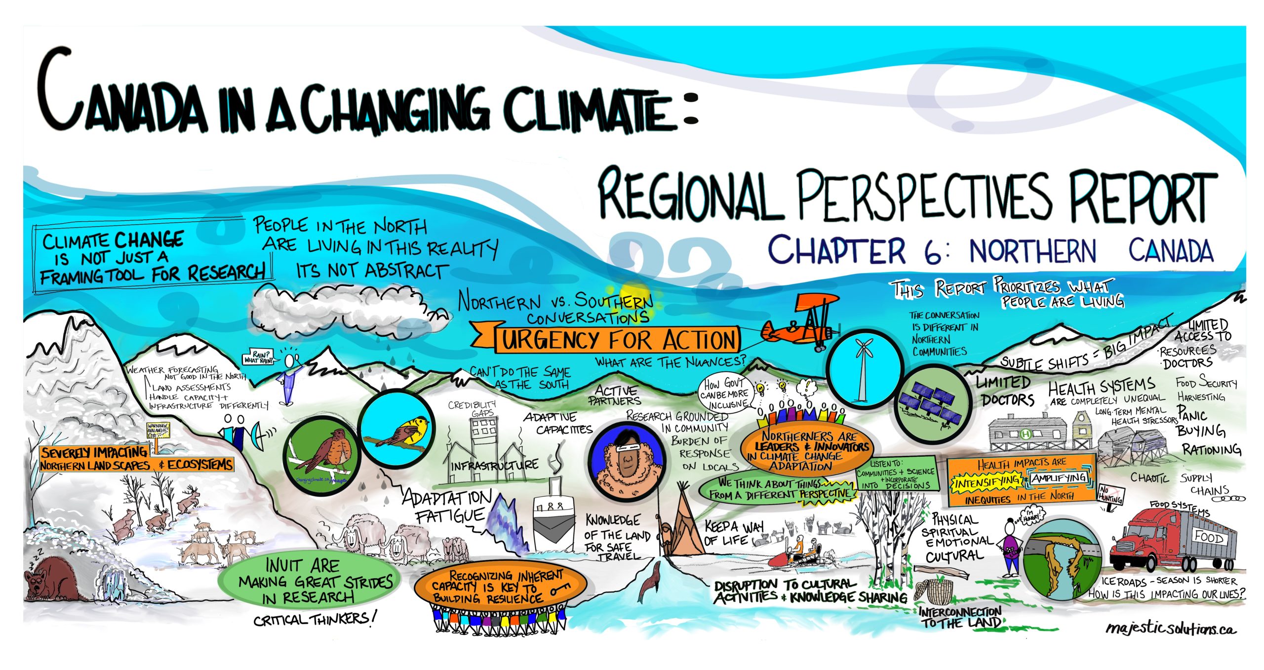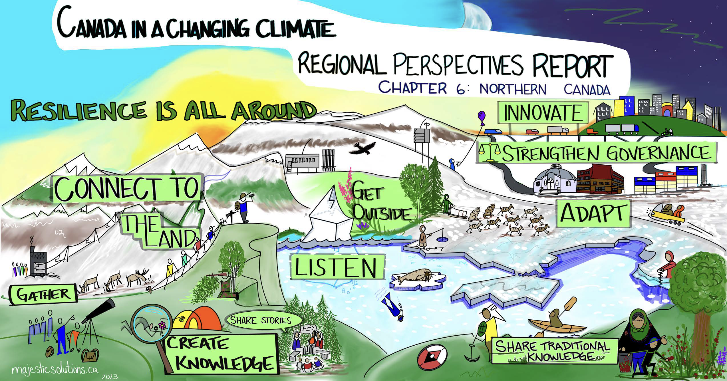 Graphics: These graphics were inspired by the Northern Canada chapter of the Canada in a Changing Climate: Regional Perspectives Report, as well as by discussions that took place about the report at the ArcticNet 2022 conference, and conversations with youth from Nunatsiavut. Developed by Majestic Solutions and Yukon University, this series of graphics for communicating climate change impacts, adaptation and resilience in the North is available in English and in Inuktitut.