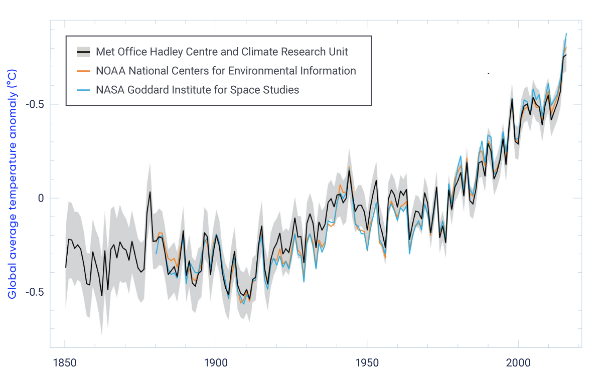 Line graph showing departure (anomaly) of global mean annual surface temperature from the average over the 1961–1990 reference period for the period 1850–2016. There are three lines showing temperature anomalies from three global datasets. The Met Office Hadley Centre and Climate Research Unit at the University of East Anglia, UK, dataset extends back to 1850 and the uncertainty range for this dataset is given. The US National Ocean and Atmospheric Administration (NOAA) National Centres for Environmental Information and NASA Goddard Institute for Space Studies datasets extend back to 1880. All three datasets are comparable, showing overall warming that was most pronounced over the period from approximately 1900 to 1940 and from 1970 onwards.