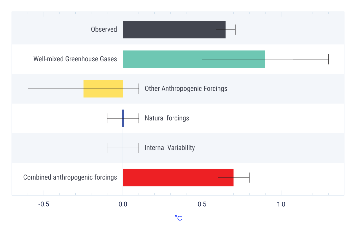The heat-trapping effect of atmospheric greenhouse gases is well-established. It is extremely likely that human activities, especially emissions of greenhouse gases, are the main cause of observed warming since the mid-20th century. Natural factors cannot explain this observed warming. Evidence is widespread of a human influence on many other changes in climate as well.