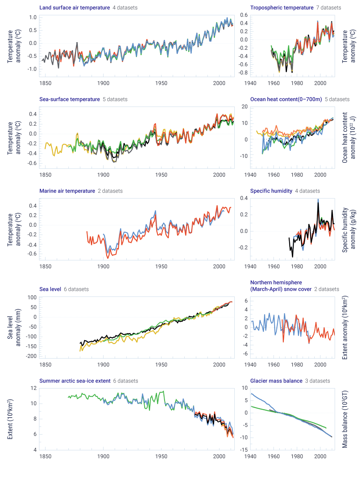 This figure displays multiple independent indicators of a changing global climate. There are 10 panels displaying observations for different elements over different time periods. Four panels display increasing land (four datasets), sea surface (five datasets), marine (two datasets), and tropospheric (seven datasets) temperatures. Increasing specific humidity is shown from four datasets. Rising global sea level (six datasets) from the late 19th century and rising ocean heat content (0−700 m depth from five datasets) from mid-century are shown. Time series show declining Arctic summer sea ice extent, Northern Hemisphere spring snow cover, and glacier mass balance.