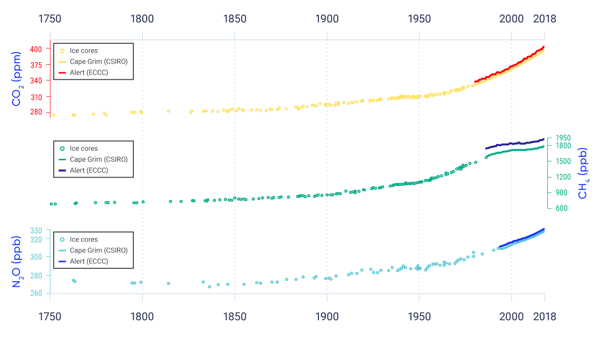 Changes in greenhouse gas concentrations over the Industrial Era