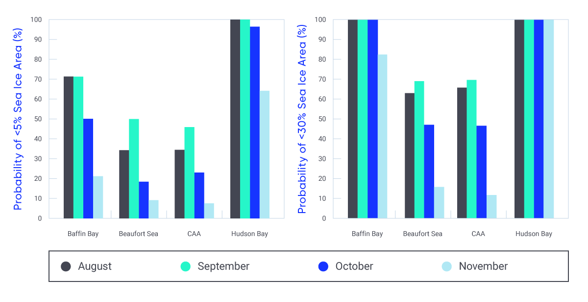 It is very likely that increased temperatures under all emissions scenarios will result in continued reduction in sea ice area across the Canadian Arctic in summer and the east coast in winter. Most Canadian Arctic marine regions will be sea ice-free for part of the summer by 2050 (medium confidence), although the region to the north of the Canadian Arctic Archipelago and Greenland will be the last area in the Arctic with multi-year ice present during the summer (very high confidence). Multi-year ice will, therefore, still drift into the Northwest Passage (and present a navigation hazard for shipping) even when the Arctic Ocean is sea ice-free during the summer.