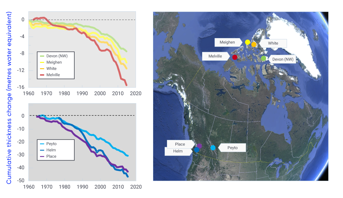 Canada’s Arctic and alpine glaciers have thinned over the past five decades due to increasing surface temperatures; recent mass loss rates are unprecedented over several millennia (very high confidence). Mass loss from glaciers and ice caps in the Canadian Arctic represent the third largest cryosphere contributor to global sea level rise (after the Greenland and Antarctic ice sheets) (very high confidence).
