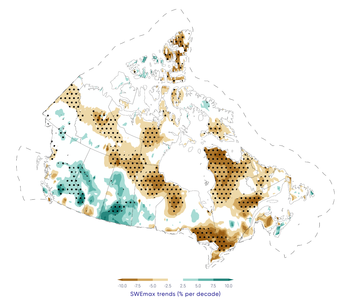 The portion of the year with snow cover decreased across most of Canada (very high confidence1) as did the seasonal snow accumulation (medium confidence). Snow cover fraction decreased between 5% and 10% per decade since 1981 due to later snow onset and earlier spring melt. Seasonal snow accumulation decreased by 5% to 10% per decade since 1981 with the exception of southern Saskatchewan, and parts of Alberta and British Columbia (increases of 2% to 5% per decade).