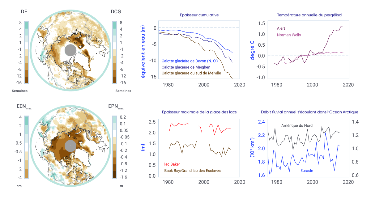 Les changements antérieurs au caractère saisonnier des écoulements fluviaux ont été caractérisés par des crues printanières précoces (augmentation de l’écoulement résultant de la fonte des neiges et de la glace au printemps) en raison des écoulements de pointe précoce de la fonte des neiges printanières, de l’écoulement plus élevé à l’hiver et au début du printemps et, pour de nombreuses régions, de la réduction des écoulements d’été. Ces changements sont en accord avec le réchauffement observé et les changements liés à la neige et à la glace. Au cours des 30 à 100 dernières années, l’ampleur des écoulements fluviaux annuels, les niveaux d’eau de surface, la teneur en humidité du sol et les sécheresses et les aquifères peu profondes ont, pour la plupart, été variables, sans tendance claire à l’augmentation ou à la baisse. Cette variabilité correspond aux variations observées d’une année à l’autre et au cours de plusieurs années dans les précipitations, qui sont en partie influencées par la variabilité naturelle à grande échelle du climat (voir le chapitre 2, encadré 2.5). Toutefois, pour de nombreux indicateurs, il y a un manque de données probantes (en particulier dans les régions nordiques du pays) pour évaluer les changements passés dans l’ensemble du Canada à la disponibilité de l’eau douce.