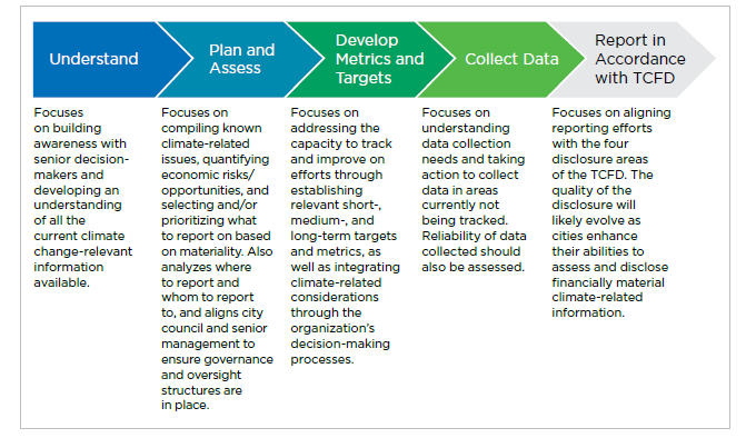 The current and future impacts of climate change present both risks and opportunities to cities and their service delivery models. Insured losses in Canada have been over CAD $1 billion per year for the past five years, with payouts in 2018 reaching nearly CAD $2 billion. In reaction to the growing costs and risks of climate change, multiple Canadian cities in recent months have declared “climate emergencies” and are responding with actions accordingly. Therefore, understanding the costs and potential economic benefits of climate change is essential for cities and their stakeholders. Cities that adopt a strategic long-term approach to climate adaptation and mitigation will be better prepared to support economic growth, attract new investors, reduce potential costs and damages, and build more resilient communities. The guide developed by CPA Canada includes five main resources that cover a general process framework for aligning a city’s internal and external reporting with the TCFD recommendations. The framework includes details for cities on the process for preparing climate-related financial disclosures and reviews best practices surrounding this area. The framework five phases include:
