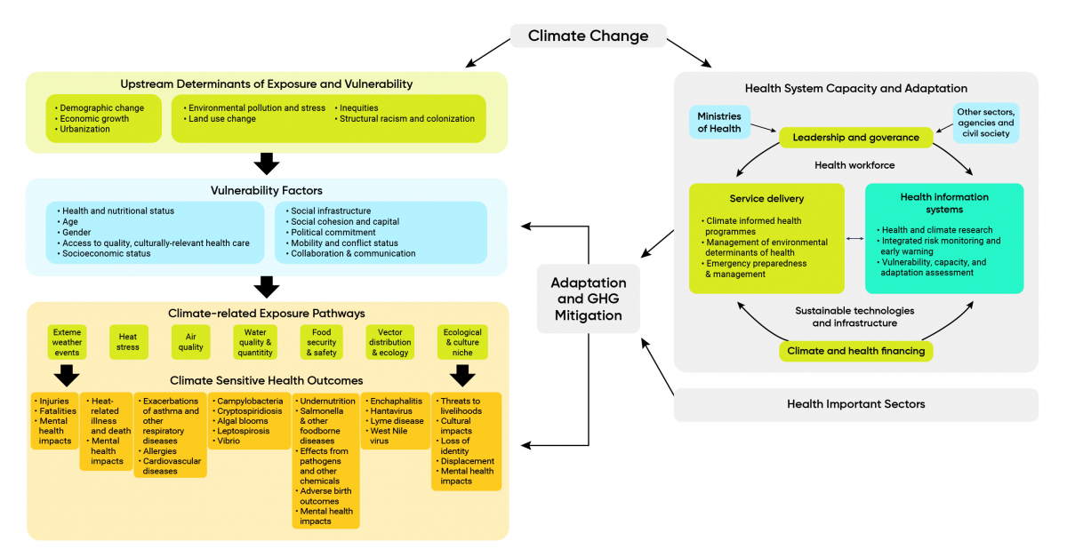 Upstream drivers related to trends such as population growth, economic growth, urbanization, colonialism, and racism can put pressures on a range of factors that can increase or decrease vulnerability to the health impacts of climate change. Health can be affected by climate change directly or indirectly, through a range of exposure pathways, as temperatures continue to rise, precipitation patterns change, and the frequency and severity of extreme weather events increase, resulting in more natural disasters (IPCC, 2012; Smith et al., 2014; Watts et al., 2015; Hoegh-Guldberg et al., 2018).