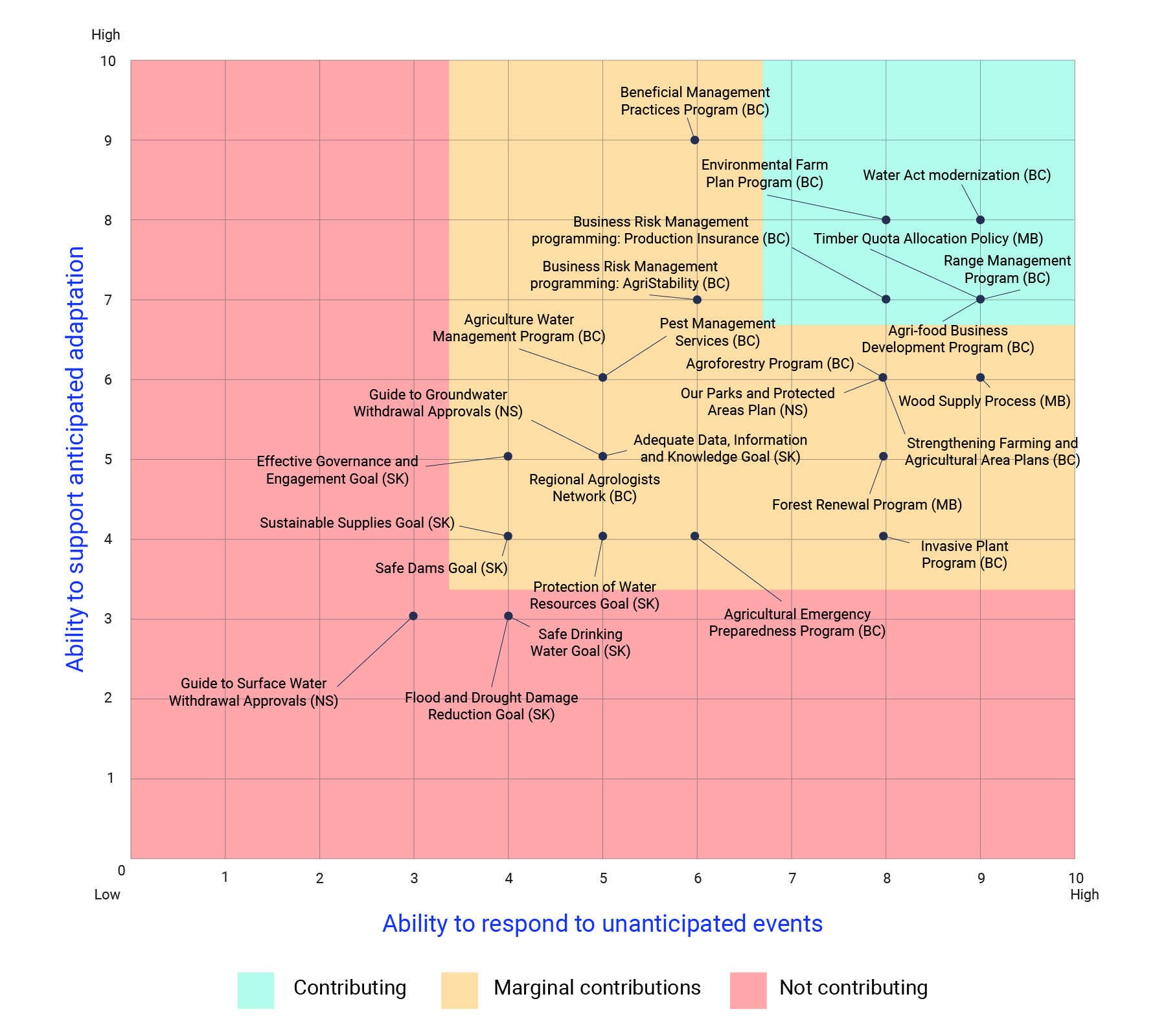 Bizikova, L., Tyler, S., Roy, D. and Swanson, D. (2013). Strengthening Adaptive Capacity in Four Canadian Provinces: ADAPTool analysis of selected sectoral policies. A synthesis report. International Institute for Sustainable Development (IISD) Report submitted to Climate Change Impacts and Adaptation Division, Natural Resources Canada. Retrieved June 2020, from <https://www.iisd.org/sites/default/files/publications/adaptool_synthesis.pdf>