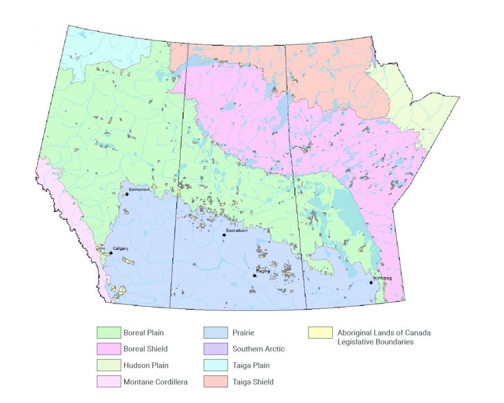 Map of the Ecozones of the Prairie Provinces also showing the Aboriginal Lands of Canada Legislative Boundaries, and major cities, rivers, and lakes.