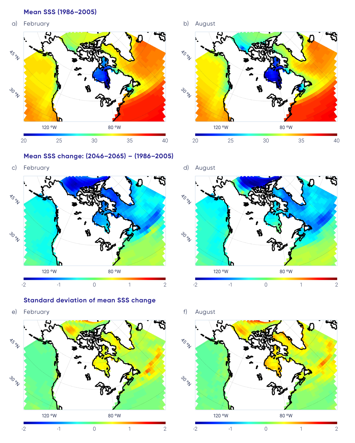 There has been a slight long-term freshening of upper-ocean waters in most areas off Canada as a result of various factors related to anthropogenic climate change, in addition to natural decadal-scale variability (medium confidence). Salinity has increased below the surface in some mid-latitude areas, indicating a northward shift of saltier subtropical water (medium confidence).