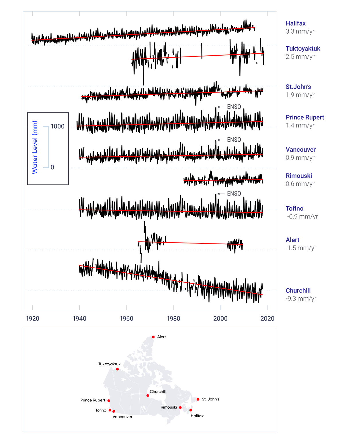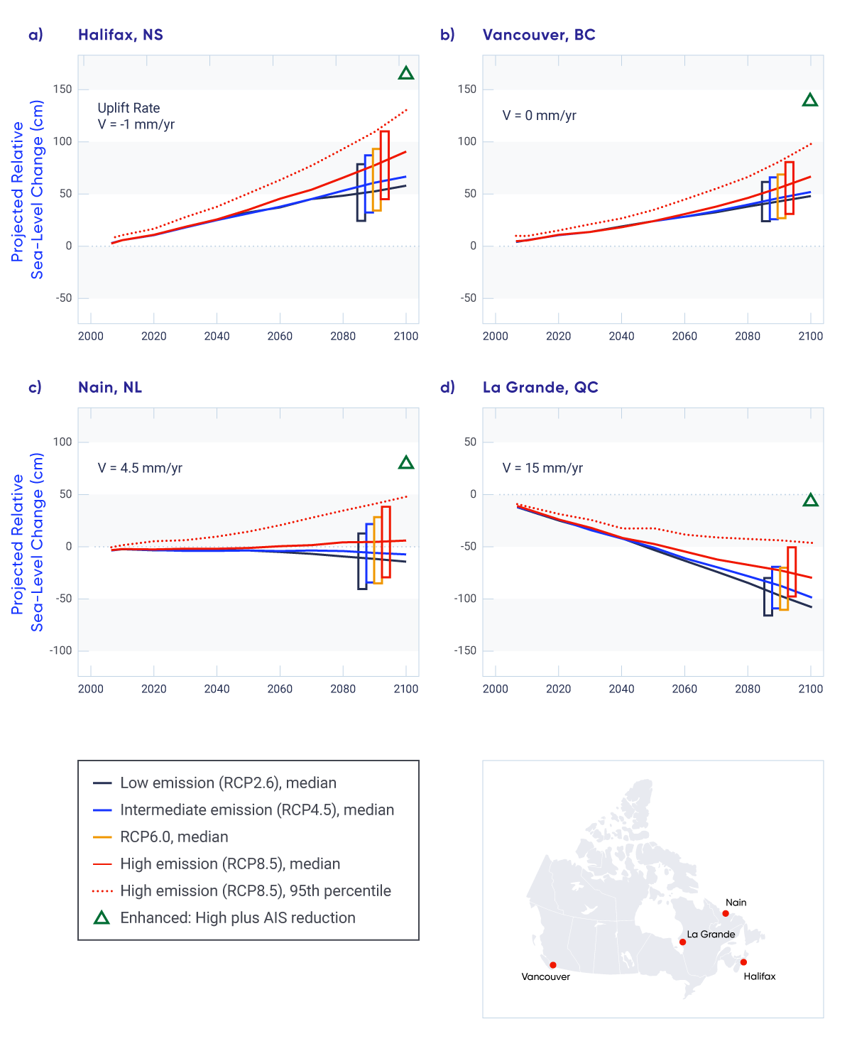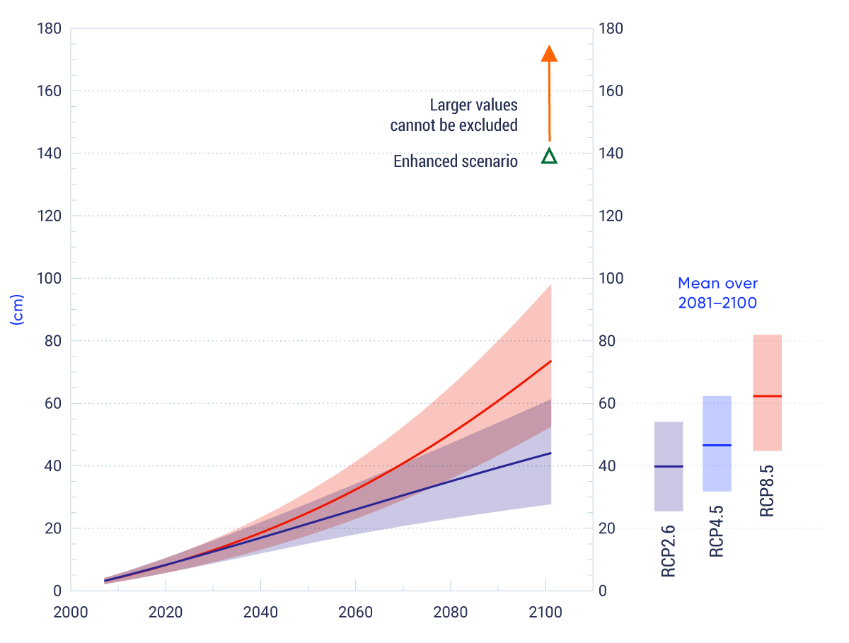 Globally, sea level has risen, and is projected to continue to rise. The projected amount of global sea-level rise in the 21st century is many tens of centimetres and it may exceed one metre. However, relative sea level in different parts of Canada is projected to rise or fall, depending on local vertical land motion. Due to land subsidence, parts of Atlantic Canada are projected to experience relative sea-level change higher than the global average during the coming century (high confidence).