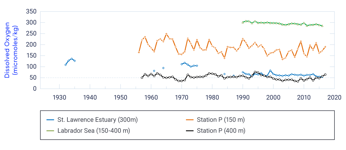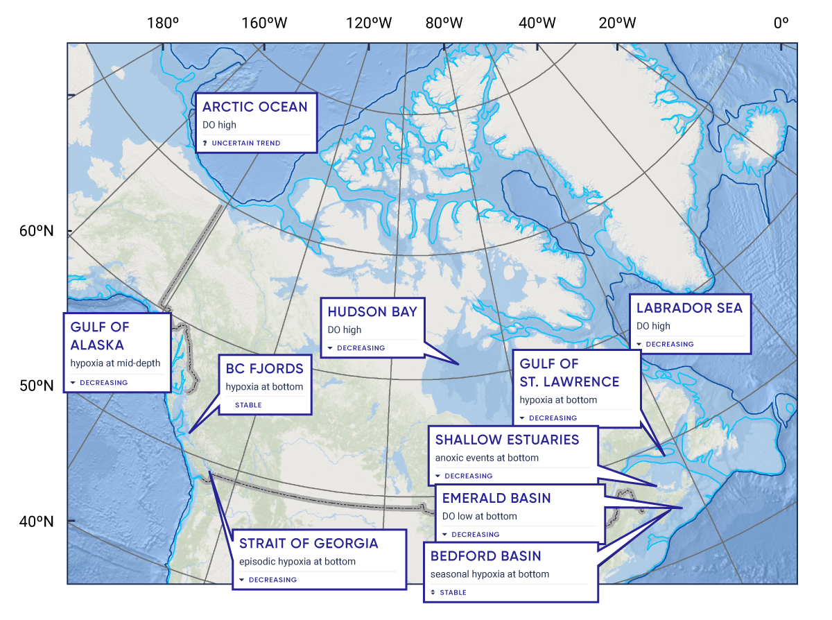 Subsurface oxygen concentrations have decreased in the Northeast Pacific and Northwest Atlantic oceans off Canada (high confidence). Increased upper-ocean temperature and density stratification associated with anthropogenic climate change have contributed to this decrease (medium confidence). Low subsurface oxygen conditions will become more widespread and detrimental to marine life in future, as a result of continuing climate change (medium confidence).
