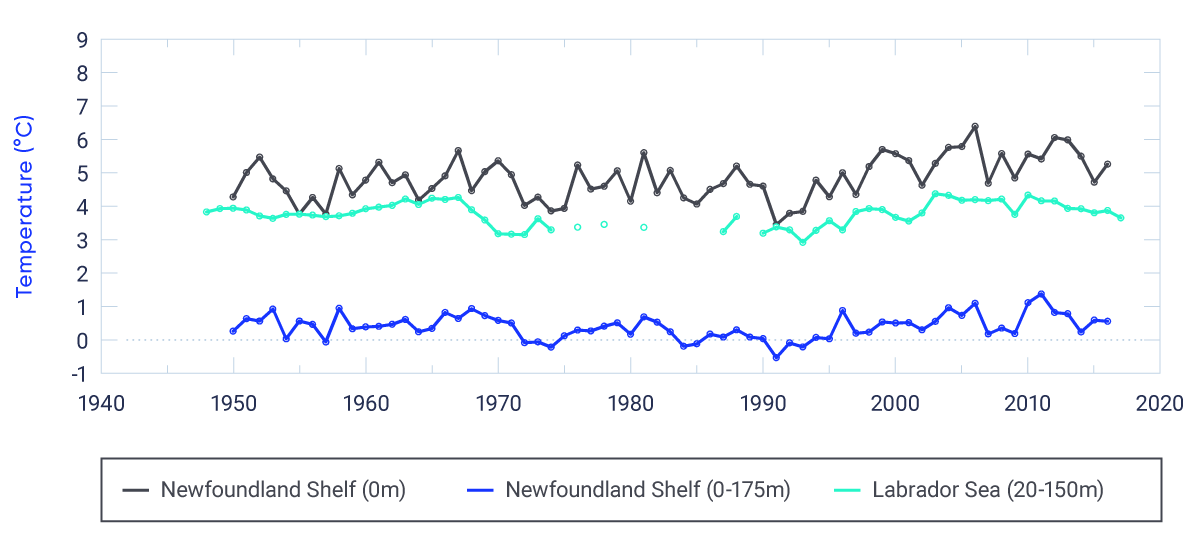Upper-ocean temperature has increased in the Northeast Pacific and most areas of the Northwest Atlantic over the last century, consistent with anthropogenic climate change (high confidence). The upper ocean has warmed in the Canadian Arctic in summer and fall as a result of increases in air temperature and declines in sea ice (medium confidence).