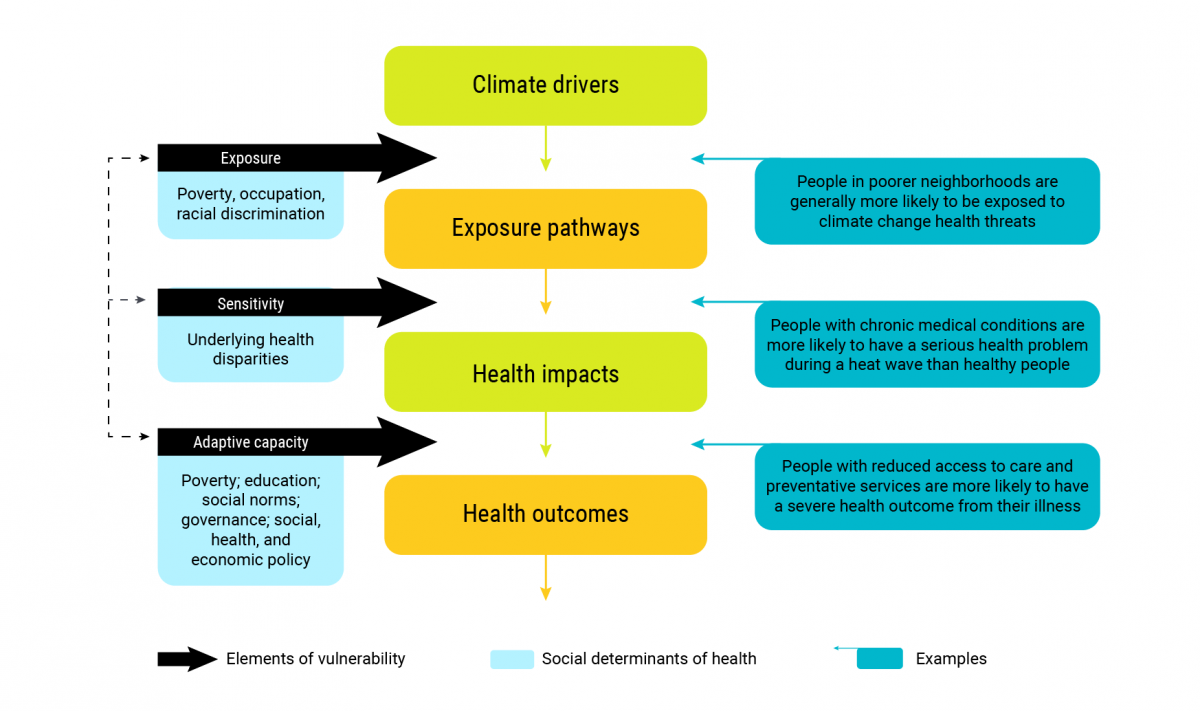 - The pathways through which climate change affects health inequities are complex and dynamic. These pathways often involve the conditions and factors that affect a person’s health, known as determinants of health (such as, income, education, employment, and working and living conditions), which can increase or decrease an individual’s exposure or sensitivity to climate-related health hazards and can create barriers that limit their ability to take protective measures.